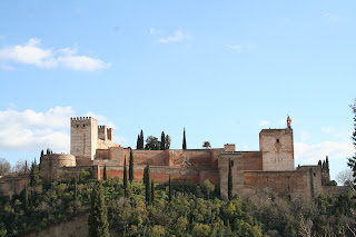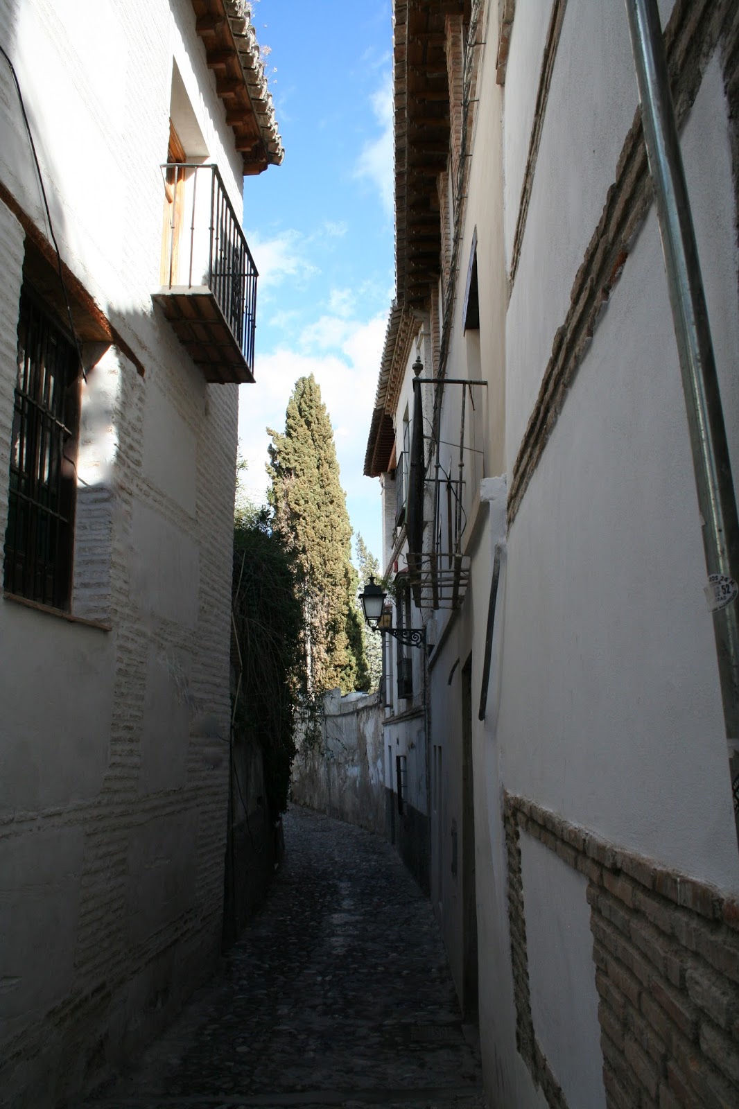 We then took a 3 hour bus ride through miles of olive groves up to Granada. I slept, so there are no pictures. We checked into the hotel, went out for tapas, then took a walking tour of the Albaicin. This neighborhood was the Arab quarter, established when Moors were driven out of other cities during the Reconquista, when Spanish Christians retook the land from the Moors who had ruled it for 700 years, and the Jews who had lived here since long before that. Winding narrow streets, whitewashed houses, balconies, and apparently cheap housing. There are beautiful views of the Alhambra and the Sierra Nevada mountains, which today are still covered with their winter snow.