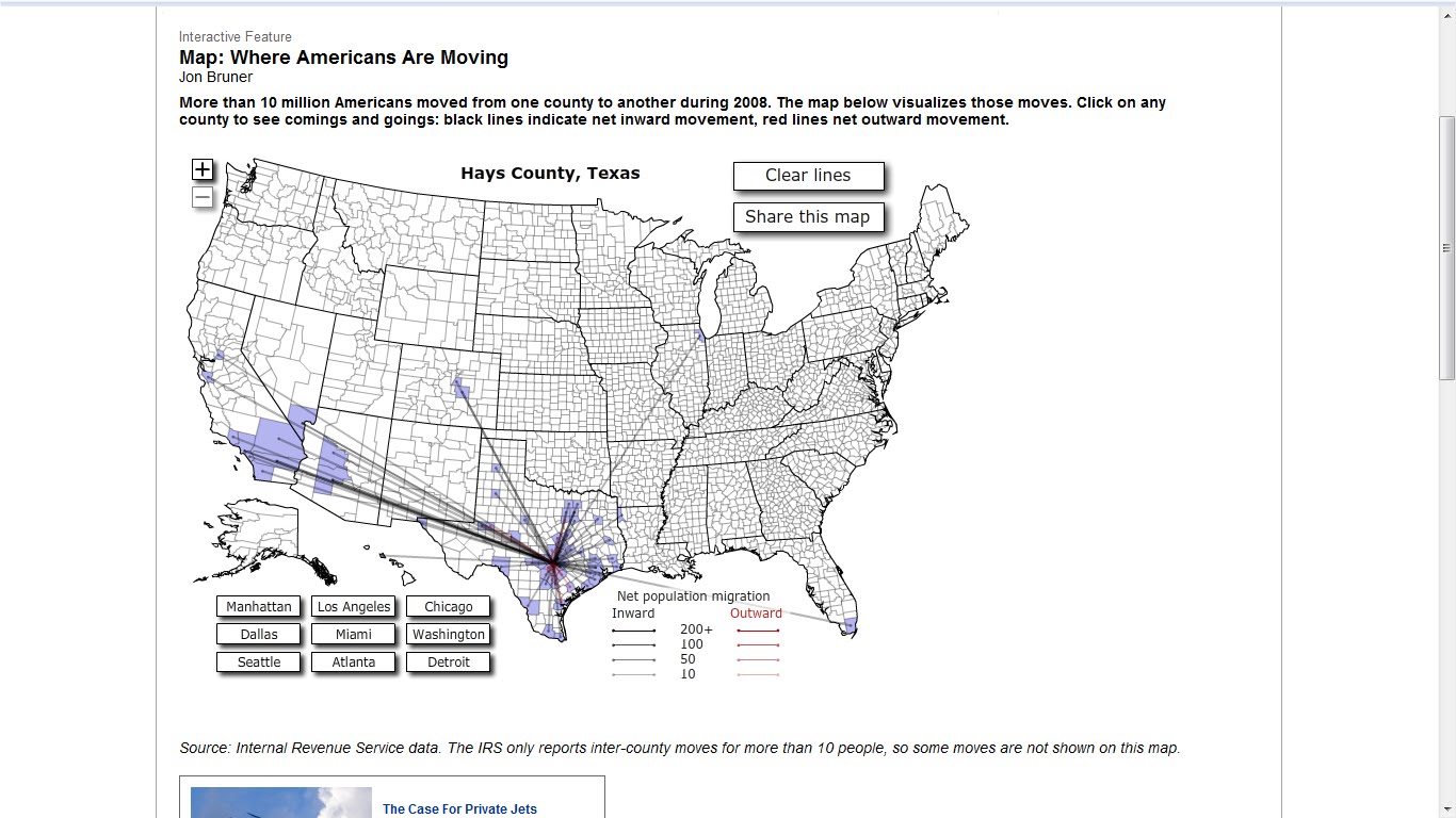 Forbes has a new map up - migration at the county level. Click on any county in the US, and see in and out migration, along with income levels, destinations, and county of origin. Can't wait to use it during the unit on population.